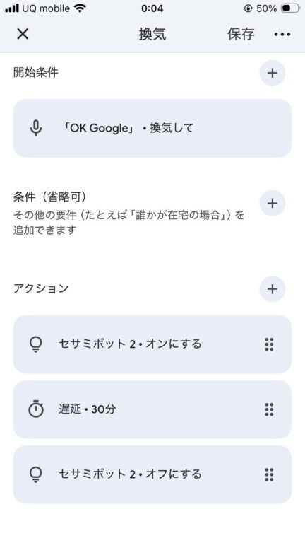 最後にすべきは自動化の設定です。参考までに音声で換気を始める設定を作ってみました。