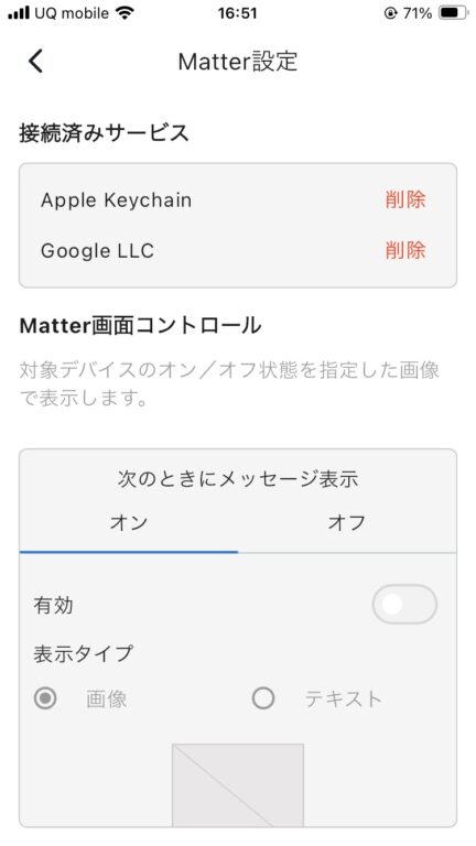 on時、off時に表示する画像の設定については、ホームタブ > 画面最上部の設定アイコンをタップ > 「Matter設定」 から行います。ここで、表示させたい画像、またはテキストをアップロードしてください。